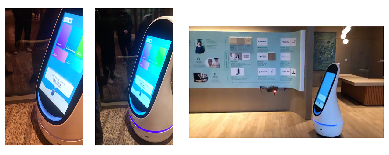 原圈科技抓住联实Lendlease服务老年客户群体存在听力、视力不好等普遍现象,专门为该养老项目研发打造了一款集集32寸大屏、自主建图、自动回充、自主避障、语音交互、人脸识别、6路麦克风于一身的超级AI智能机器人服务于老年客户群体。当老年人来访时,凭借机器人超大音量与来访者互动、带领客户并讲解项目情况。